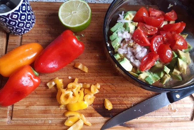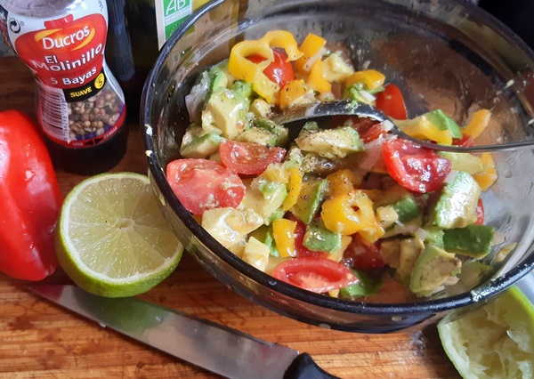 Zmieszać wszystkie warzywa z awokado. Doprawić oliwą (nie za dużo, awokado jest tłuste), sokiem z limonki, solą i pieprzem.