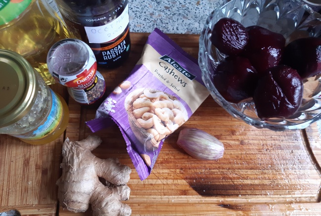 Kolejna sałatka ma dla mnie zdecydowanie jesienny charakter. Już sam kolor buraków – ugotowanych lub upieczonych – ma barwę głęboko jesienną. Samo zdrowie, zawierają przeciwutleniacze. Składniki winegretu, czyli imbir i miód, rozgrzewające, są tradycyjnie używane przy przeziębieniach i przy ich profilaktyce. A jak ładnie można podać takie buraki, gdy je pokroimy w jak najcieńsze plasterki.