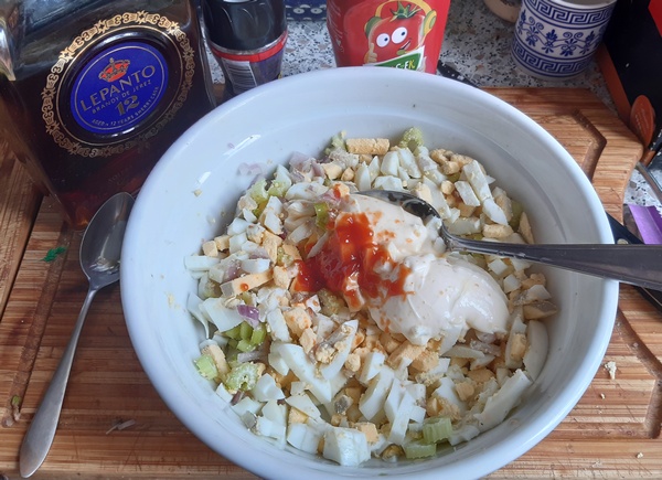 Majonez rozetrzeć z ketchupem (proporcje dowolne, jak nam pasuje) i brandy. Wmieszać w jajka z warzywami. Sałatka jest dobra, gdy jest schłodzona, do czasu podania warto ją trzymać w lodówce.