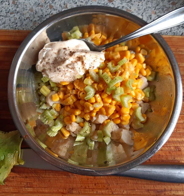 Wymieszać kawałeczki kalafiora, selera i kukurydzę. Doprawić majonez pieprzem. Dodać do warzyw. Do czasu podania trzymać w lodówce.