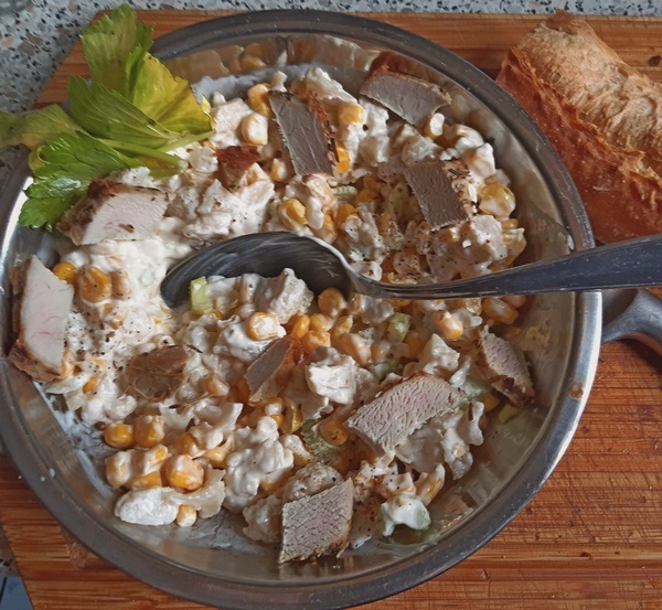 Taka sałatka podana z pieczywem stanowi kompletne danie. Lubię takie obiady. W dodatku pomagają zużytkować resztki. O czym zawsze warto pamiętać i niczego nie wyrzucać. Byle nie trzymać w lodówce dłużej niż dzień, dwa dni!