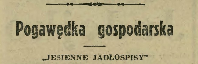 Miałam jednak mówić o jesiennych jadłospisach, te pomimo letniej pogody nie mogą być podobne do letnich. Z powrotem młodzieży do szkół intensywniejsze jej odżywianie staje się konieczne. Znikają ze stołu chłodniki i owocowe, zimne zupy. Zsiadłe mleko nie stanowi już codziennej kolacji przeciętnego, stołecznego inteligenta. Ciepło jest wprawdzie, ale talerz gorącej zupy na początku obiadu lepiej smakuje od jarzynowej surówki. Surówkę tę wprawdzie zachować należy, lecz inaczej ją umieścić. Może ona zastąpić drugą, lżejszą jarzynę do dania mięsnego, lub sama być jedną z dwóch obowiązkowych dań „drugich” w kuchni jarskiej. Dbając o największe urozmaicenie naszych jadłospisów obiadowych należy zawsze dawać dwie jarzyny, bądź to jako samodzielne dania – przy reżymie jarskim, bądź to jako dodatki do mięsa czy ryby tam, gdzie to mięso nie jest wyklęte. Nie powinny to jednak być jarzyny podobne ze składowych części, naprzykład kartofle i makaron – lub marchewka i buraczki. Jedna jarzyna, bardziej fundamentalna, obfitując w węglowodany to i kartofle, makaron, kluski, ryż, groch, fasola, soczewica i wszelkie kasze; druga, lżejsza, zawierająca witaminy, to: kalafiory, groszek, fasolka zielona, kapusta włoska, bulwy włoskie, brukselka, marchewka, buraczki i t. p. a głównie wszelkie surówki i sałaty sezonowe. Pozatem jako zakończenie obiadu jakaś potrawa, w której skład wchodzą owoce.