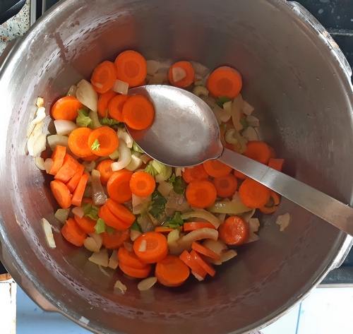 Marchewki, cebulę, czosnek pokroić, przez kilka minut smażyć na oleju, ale nie rumienić.