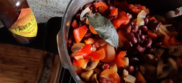 Dodać ugotowaną fasolę. Dusić jeszcze z 10 minut. Zaostrzyć, jeśli potrzeba, kilkoma kroplami tabasco, ew. smak złamać cukrem.
