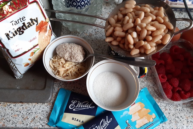 Fasola pozwala na przyrządzanie wielu potraw. Dalej będą przykłady. Na początek jednak fasolowe ciasto. Nadzwyczaj smaczne. Udaje się nawet komuś tak nie nawykłemu do wypieków jak ja. Aby je przyrządzić, zaopatrzmy się w fasolkę cannellini w puszce (do kupienia!), w białą czekoladę, migdały i owoce. U mnie były to maliny, ale teraz, w listopadzie, mogą być sezonowe figi, śliwki, winogrona.