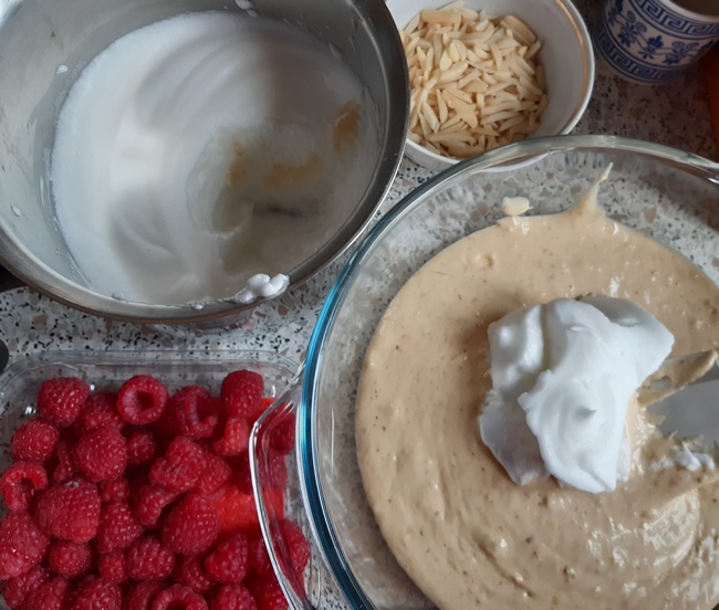 Białka ubić na pianę ze szczyptą soli. Pianę z białek wmieszać stopniowo do ciasta (najpierw 1/3, dobrze wymieszać i delikatnie dodać resztę)
