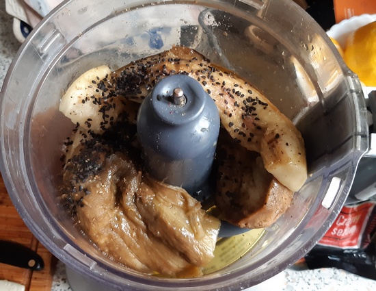 Miąższ bakłażana obrać ze skórki, jeśli ma pestki – usnąć je. Ten miąższ bakłażana zmiksować z sezamem, dobrą łyżką lub dwiema tahini, oliwą (łyżka) i sokiem z cytryny, solą i pieprzem. Spróbować po zmiksowaniu, ewentualnie doprawić sokiem z cytryny lub solą, jak potrzeba. Gdyby pasta była zbyt rzadka, zmiksować ją jeszcze raz z łyżką tahini.