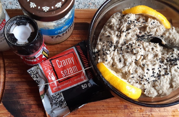 Pasta z bakłażana, z pewnym dodatkiem, jest bardzo prosta do wykonania. Smakuje naprawdę współcześnie. Dla rodzinnych wegetarian (coraz ich więcej) – znakomita. Od typowego tzw. kawioru z bakłażana (kto nie wiem, co to jest, niech poszuka; ja także opisywałam) różni ją dodatek tahini, czyli pasty sezamowej. Co czyni ją podobną do hummusu, który niektórzy uwielbiają. Przy czym jest od hummusu lżejsza, bo zamiast ciecierzycy, zawiera właśnie bakłażana.