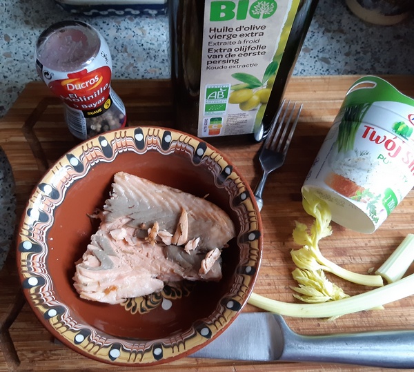 Druga pasta będzie rybna. Można do niej wykorzystać resztki wigilijnej ryby. Oczywiście, nie tej z galarety czy smażonej w panierce. Ale już pieczona, byle bez sosu, będzie bardzo dobra. Gotowana także. U mnie był to pieczony łosoś. Jest to pasta wybitnie łatwa do przyrządzenia. Można poprosić o pomoc nawet małe dzieci.