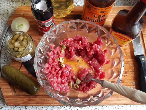 Mięso zemleć (nie za mocno) lub, lepiej, posiekać ręcznie. Wymieszać z żółtkiem (jajko przed rozbiciem sparzyć; białko można przechowywać zamrożone), olejem, kilkoma kroplami sosu Worcestershire i maggi do smaku (można wziąć tylko jedną z tych przypraw). Do smaku doprawić solą i pieprzem.