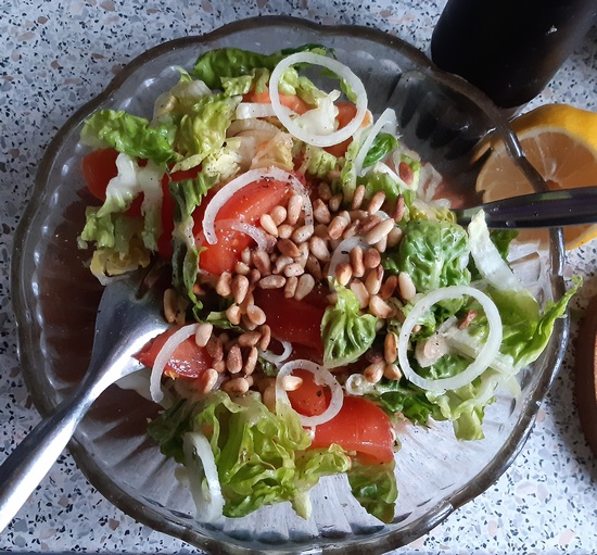 Drugą była sałata (rzymska, ale może być każda inna) z cząstkami pomidora, krążkami cebuli (słodkiej) i prażonymi orzeszkami piniowymi. Z winegretem z oliwy i soku z cytryny. Cebulę dla wrażliwych żołądków można sparzyć.