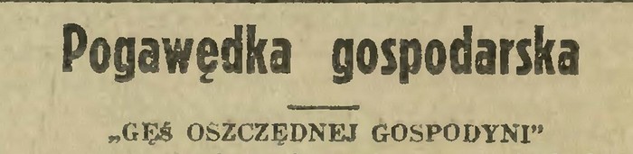 – Postaram się ciebie przekonać, że racjonalnie zużyta gęś okaże się nietylko [tak!] o połowę tańsza od zachwalanej przez ciebie polędwicy, lecz i specjalnie warszawskiego przysmaku, schabu. Masz sześć osób w domu i kupiłaś młodą, nieprzetuczoną, czterokilową gęś z podrobami. Dzielisz ją w następujący sposób: odbierasz jej podroby: skrzydła po pierwszy staw, żołądek, serce, szyjkę z głową, wątrobę i nóżki. Następnie odrąbujesz udka, grzbiet, kuperek i kark. Piersi pieczesz, do nich dajesz duszoną kapustę, pieczone jabłka, kilka dużych wraz z gęsią upieczonych całych kartofli. Piersi należy pokrajać bądź na długie filety, bądź z obu stron na poprzeczne plastry. W jednym i drugim razie możesz wykrajać po 12 cienkich kawałków i wraz z trzema jarzynami masz sute podstawowe danie obiadowe. Uda, grzbiety i kuperek gotujesz na galaretę, robisz sześć kawałków z ud i sześć z grzbietu z kuperkiem. Do galarety dajesz sutą sałatę kartoflaną i chrzan z octem. Masz znowu obiadowe danie, przy jakimś kapuśniaku z tłuczonymi kartoflami, barszczu wołyńskim lub innej zawiesistej pożywnej zupie. Trzeciego dnia gotujesz czerninę z kluskami lub ogórkową zupę na dróbkach, przyczem skórkę z szyi nadziewasz kaszką krakowską ze szmalcem gęsim i majerankiem i gotujesz razem. Masz z niej sześć dużych kawałków, skrzydła same, szyjka, głowa i żołądek dadzą jeszcze dwanaście mniejszych kawałków. Sypka kasza perłowa, jarzynka z brukwi i sos grzybowy ze śmietaną. Masz cały bardzo obfity i smaczny obiad.