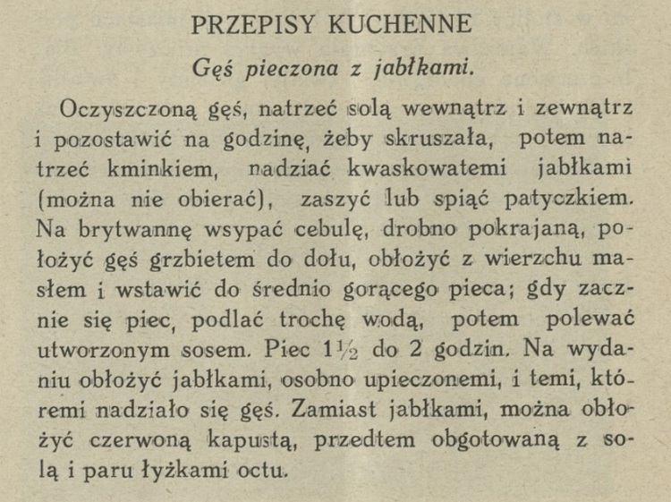 Pojęcia przedwojenne i powojenne [pisała o I wojnie światowej!] o gęsi uległy poważnym zmianom. Przed wojną gęś była uważana za smaczną wprawdzie, lecz bardzo pospolitą „gospodarską” potrawę, której nie wypadało podawać na „proszonym” przyjęciu. Żartowano z Niemców, że gęsi od święta jadają, uważano to za brak wykwintnego gustu. Gęś uważano za „żydowskie” pieczyste i jeżeli w życiu codziennym podawano na stół, to wskutek specjalnie „pospolitego” gustu kogokolwiek z rodziny.