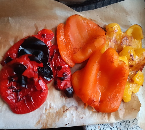 Strąki papryki przekroić na pół, pozbawić nasion, połówki rozłożyć na papierze do pieczenia, opiec pod opiekaczem piekarnika. Po upieczeniu przestudzić w plastikowej torebce, zdjąć z nich skórkę. Pokroić. Cebulę przekroić na pół i w półplasterki, sparzyć je. Podobnie skroić sparzoną cytrynę ze skórką (ew. pestki usunąć).