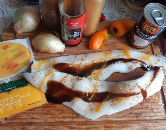 Zwiększyć ogień, dołożyć filety, smażyć aż lekko się zazłocą. Dodać przyprawę kari, rozmieszać. Chwilę podsmażać, wlać mleko kokosowe i pokruszone ostre papryczki, zmniejszyć ogień, dusić, aby smaki się połączyły. Przed podaniem posypać szczypiorem.