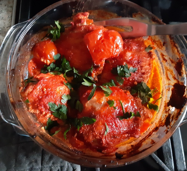 Pół godziny przed pieczeniem wyjąć z lodówki, skropić olejem (oliwą). Obłożyć przekrojonymi na pół pomidorkami i pokrojoną w kostkę podobnej wielkości papryką. Piec 30–40 minut w 180 st. C, obracając w połowie i polewając wytwarzającym się sosem.