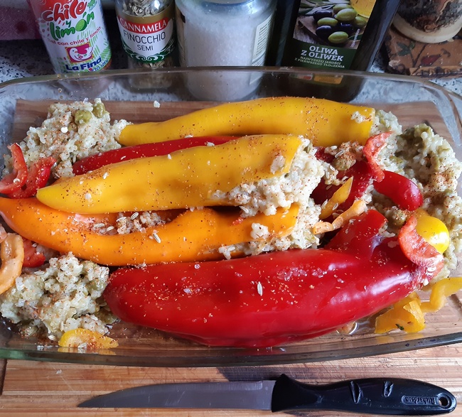 Oliwą skropić naczynie żaroodporne do zapiekania. Ułożyć nadziane papryki, jeśli farsz ryżowy został – można wyłożyć go obok strąków. Wstawić do piekarnika, zapiekać ok. 30 minut w temp. 180 st. C. Po tym czasie podlać passatą pomidorową, lekko posolić, posypać papryką sypką, ziarenkami kopru włoskiego i pokruszoną papryczką chili. Obłożyć pomidorkami koktajlowymi. Zapiekać jeszcze 10 minut.