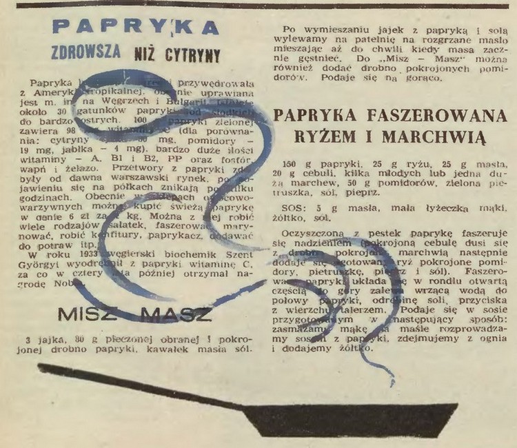 A teraz szybko przejdźmy do lat 60. XX wieku, do czasów PRL-u. Właśnie wtedy zaczęto sprowadzać paprykę z Bułgarii. No i propagować jej spożycie. Przykład z tygodnika „Stolica” z roku 1961. W charakterystycznej dla ówczesnych pism estetyce graficznej.