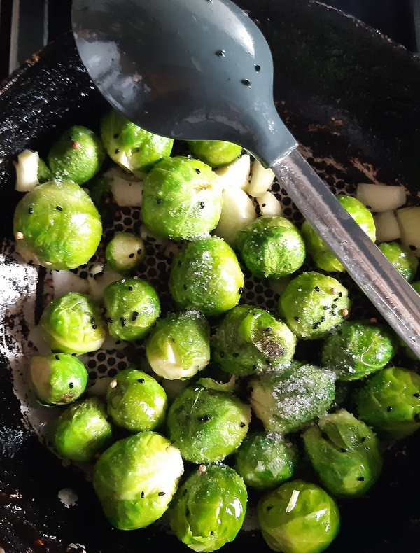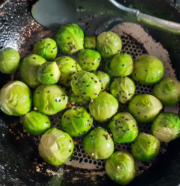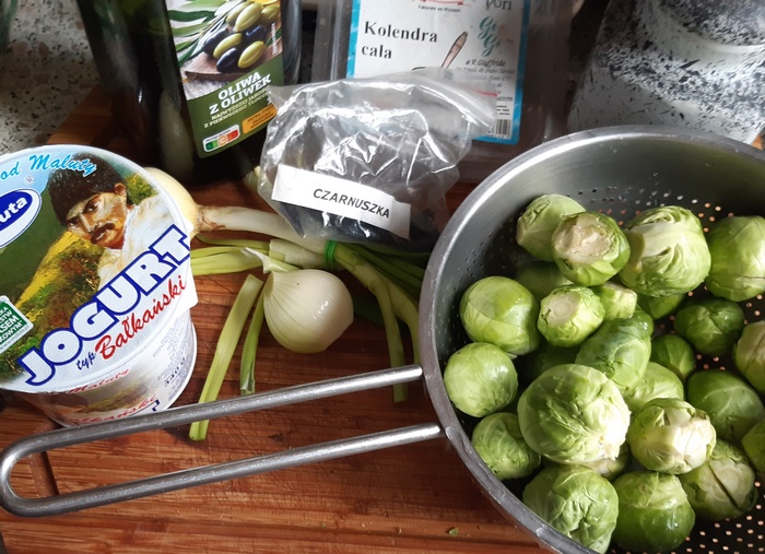 Na patelni rozgrzać oliwę, zeszklić cebulkę drobno pokrojoną w kostkę. Dorzucić po łyżce ziaren kolendry i czarnuszki, zasmażyć razem przez chwilę. Dodać suchą brukselkę, mieszając smażyć.