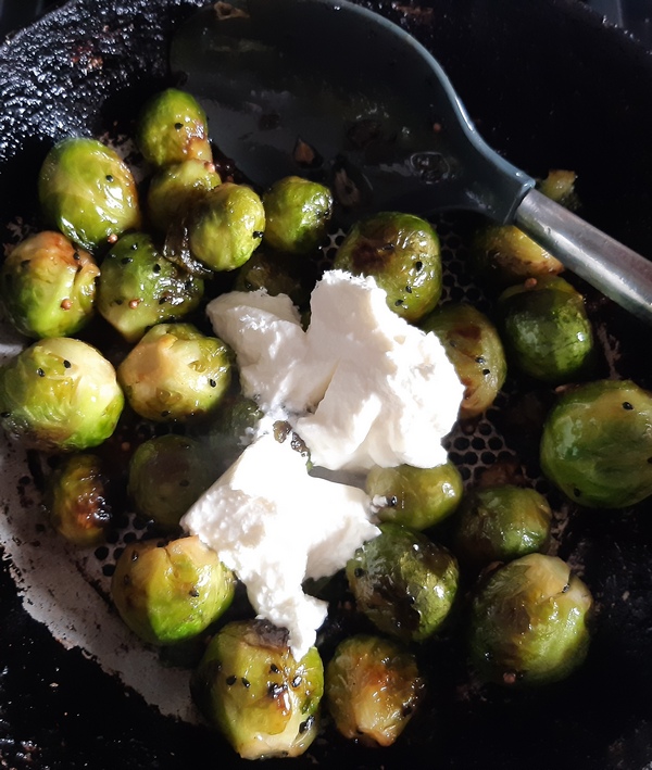 Gdy kapustki zmiękną, dodać 3–4 łyżki jogurtu. Szybko wymieszać. Podawać od razu.