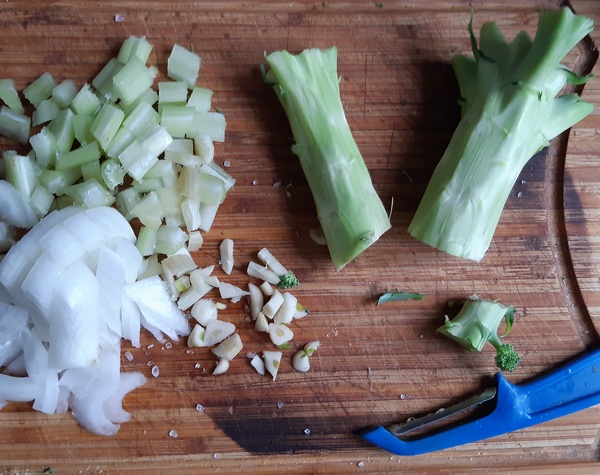 Brokuły obmyć, oczyścić łodygę, odciąć różyczki, odłożyć. Łodygi pokroić w drobna kostkę, tak samo pokroić oczyszczony seler naciowy, podobnie pokroić oczyszczoną cebulę. Czosnek posiekać.