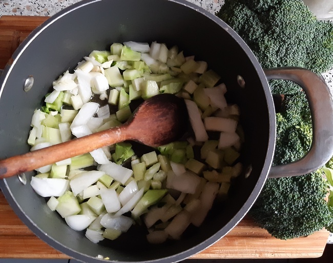 W garnku, w którym zupa będzie się gotowała, rozgrzać oliwę, zasmażyć kostki brokułowych i selerowych łodyg z cebulą i czosnkiem. Nie powinny się przyrumienić, lecz tylko zmięknąć.