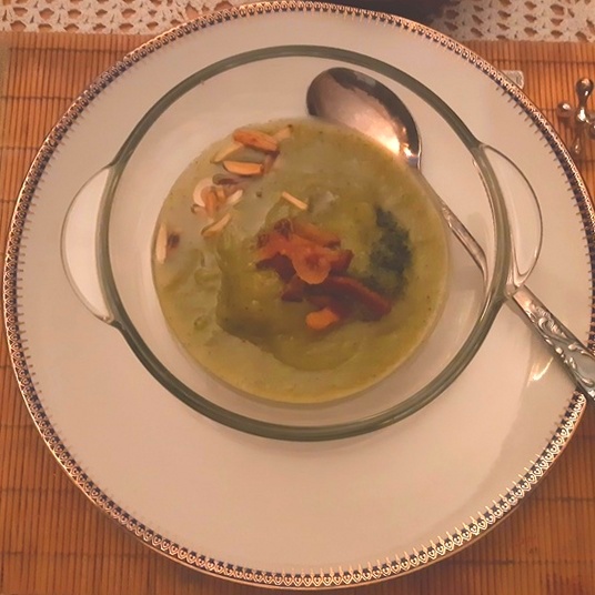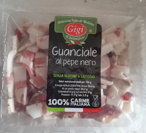 Do tej kremowej zupy podałam płatki migdałów uprużone na suchej patelni oraz wysmażone, też bez tłuszczu, cienkie płatki guanciale – niedawno kupiłam to pochodzące z Włoch delikatne podgardle, tu w czarnym pieprzu.
