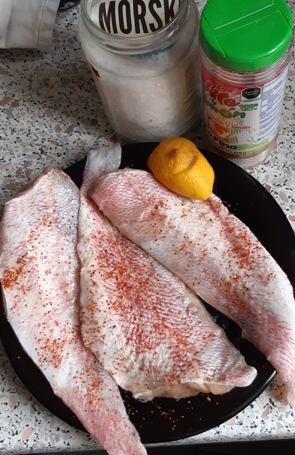 Zdjąć z patelni. Dolać nieco oleju, rozgrzać. Filety ryby oczyścić z ości itp., skropić sokiem z cytryny, posolić.