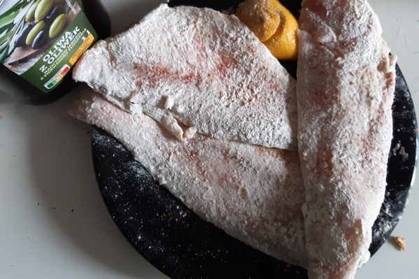 Rybę obtoczyć w mące, strzepnąć jej nadmiar.