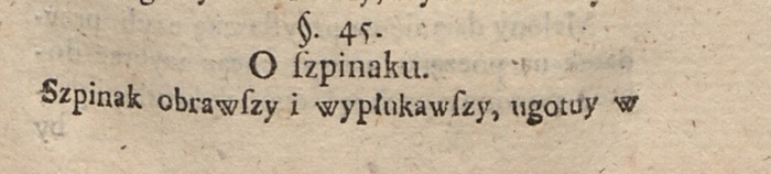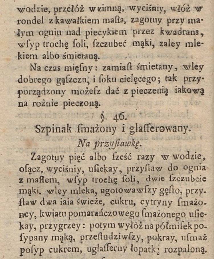 Szpinak znał i opisał Wojciech Wielądko, kucharz doskonały (tak zatytułował swoje znakomite dzieło kulinarne), który gotował dla Stanisława Augusta Poniatowskiego, ostatniego króla Polski.