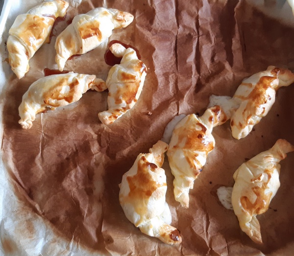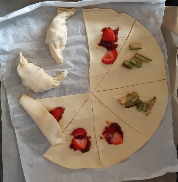 Gdy kilka szparagów zostanie, można je wykorzystać do upieczenia rogalików. Takich mało ambitnych – z gotowego ciasta. Ja wzięłam francuskie, ale kruche też może być. Połowę rogalików nadziałam szparagami, połowę truskawkami. Te podałam do kawy jako deser.