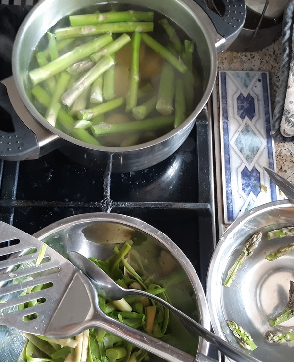 Łodygi szparagów zalać wodą (np. 1/2–3/4 l wody na standardowy pęczek szparagów) lub bulionem (wtedy nie solić). Gdy chce się zupę mieć treściwszą, dodać 1–2 ziemniaki pokrojone w kostkę. Główki szparagów odłożyć.