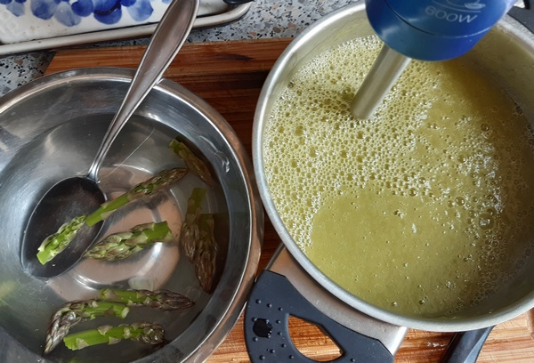 Zupę po 20 minutach zmiksować. Doprawić o smaku. Dodać główki szparagów i gotować jeszcze ze 3 minuty. Podawać mocno ciepłą lub letnią.