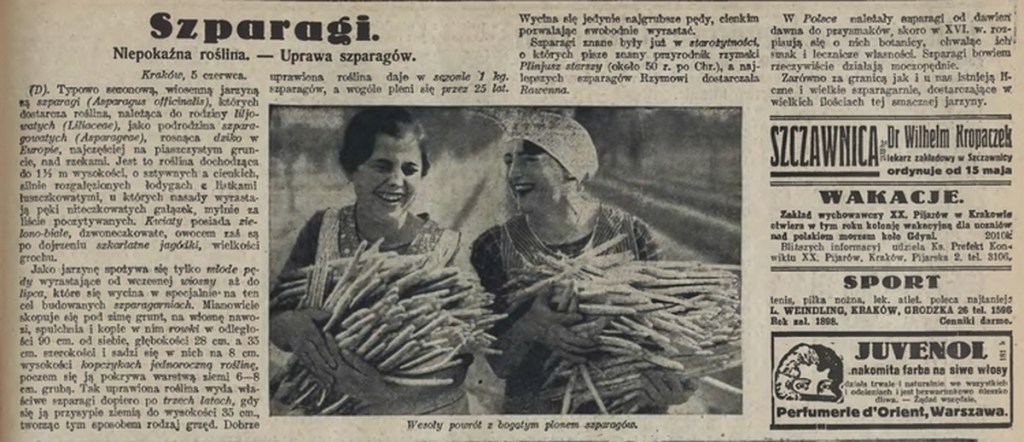 Przedwojenne szparagowe żniwa pokazał i opisał krakowski „Kurier Literacko-Naukowy” w roku 1927. Ale piękne i dorodne okazy!