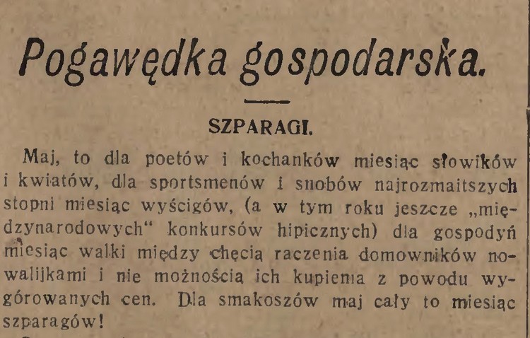 Dopełnię szparagowego szczęścia (bardzo lubię każde szparagi!) felietonem gospodarskim z roku 1927. Elżbieta Kiewnarska, czyli Pani Elżbieta zamieściła go w „Kurierze Warszawskim”, oczywiście w maju. Podaję go w całości, aby zachować ducha czasów. Zachowałam archaiczną pisownię, choć trochę poprawiłam w nim interpunkcję i oczywiste błędy, wyróżnienia też są moje. Felietonistka wskazuje, skąd się biorą dłuuugie szparagi (patrz zdjęcie wyżej) i dlaczego nie są pożądane.
