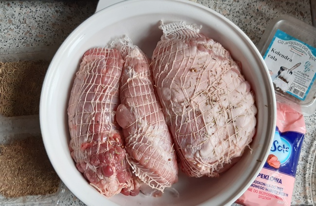 Na zdjęciach z peklowania są trzy kawałki mięsa. Największy to karkówka, dwa mniejsze to szynka wieprzowa i pierś indyka; te dwa ugotowałam.