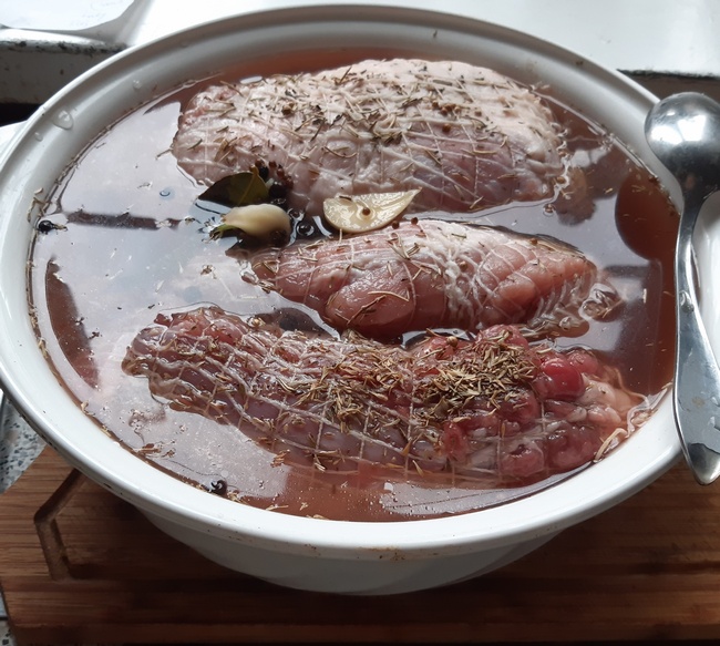 Mięso obmyć, osuszyć, zasznurować nicią kuchenną lub włożyć w siatkę do pieczenia (sprzedawana przy stoiskach mięsnych w hipermarketach). Natrzeć suszonymi ziołami. W dużym rondlu zagotować tyle wody z korzeniami, aby pokryła prawie cały kawał mięsa, włożyć czosnek. W przestudzonym wywarze rozpuścić sól do peklowania w proporcji podanej na opakowaniu, zanurzyć mięso. Odstawić na 3–7 dni, zgodnie z opisem na opakowaniu soli. Przewracać mięso co najmniej raz na dobę, gdy nie jest w całości zanurzone – częściej.