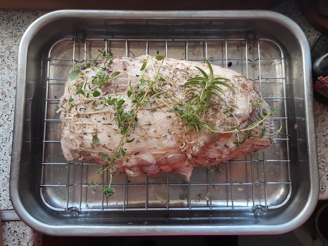 Piekarnik nagrzać do 220 st. C. Mięso wyjąć z wywaru do peklowania, wylać go. Mięso osuszyć, obłożyć świeżymi ziołami, skropić olejem. Ułożyć na kratce do pieczenia, pod którą nalać wody (lub w naczyniu żaroodpornym podlać odrobina wody, którą podczas pieczenia uzupełniać).