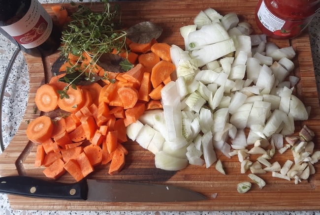 Warzywa podsmażyć na tej samej patelni dolewając nieco oliwy, zaczynając od marchwi, potem dołożyć cebulę i czosnek. Mieszać podczas smażenia. Gdy po kilku minutach stracą surowość, zalać je szklanką wina. Mieszać, aby z patelni zeskrobać smaki pozostałe ze smażenia mięsa i warzyw. Gdy wino odparuje, wlać szklankę bulionu. Mięso ułożone w naczyniu do pieczenia zalać wywarem z warzywami, wlać pozostałe wino i bulion. Dodać koncentrat pomidorowy.