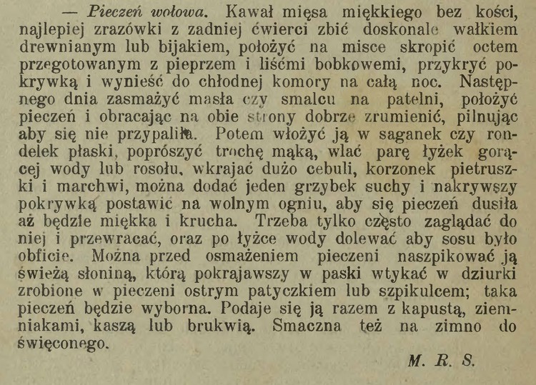 Dla porównania inna pieczeń wołowa. Bez niej nie wyobrażano sobie w domach majętnych obiadu. Podało przepis pismo „Ziemianka” w roku 1911. Było organem Koła Ziemianek, a redagowała je sama Maria Rodziewiczówna.