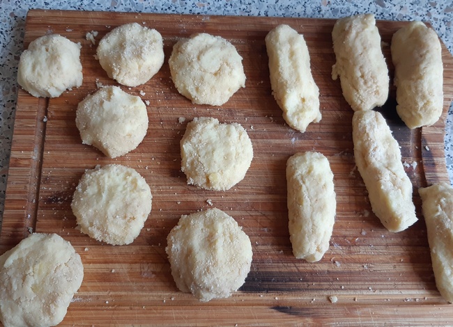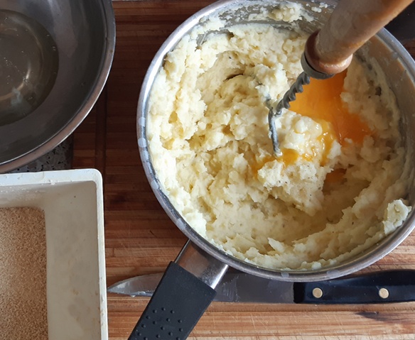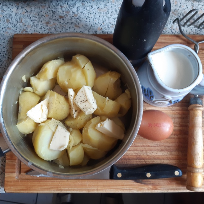 Ziemniaki ucierać z masłem i 1–2 żółtkami. Aby uzyskać konsystencję ciasta dającego się lepić, dodać śmietanę. Posolić do smaku i popieprzyć.
