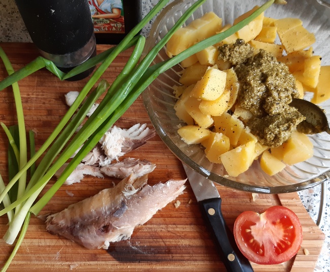 Zimne ziemniaki rozgrzać wrzucając na chwile do wrzącej wody. Obrać ze skórki, Pokroić. Makrelę obrać ze skórki i ości, podzielić na cząstki. Szczypior razem z cebulką posiekać (trochę pozostawić). Pomidor pokroić w półplasterki. Ziemniaki wymieszać z pesto w dowolnej ilości, lecz by było dobrze wyczuwalne. Dodać pozostałe składniki (bez pomidora). Wymieszać, dodać oliwę, jeśli peso zbyt suche. Posolić do smaku, popieprzyć. Przybrać pomidorem i pozostawionym szczypiorem.