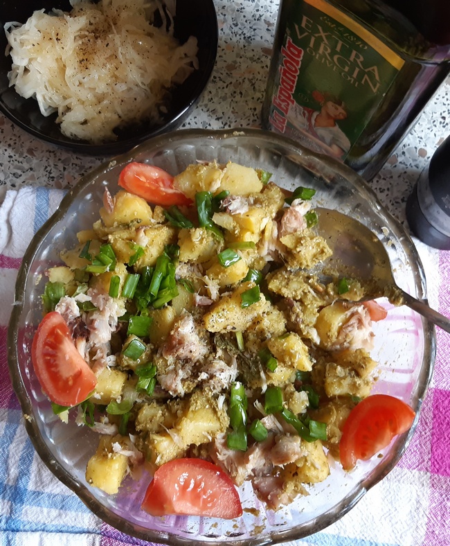 Tę sałatkę przyrządzałam i podałam lekko ciepłą (pesto przydaje smaku ciepłym ziemniakom) z dodatkiem surówki z kiszonej kapusty. Makrelę można zastąpić inną wędzoną rybą, np. znacznie delikatniejszym pstrągiem. Wtedy jako surowy dodatek bardziej będzie pasowała sałata z winegretem. A może surówka z papryki? Warto ją opiec, zawsze jest wtedy lepsza!