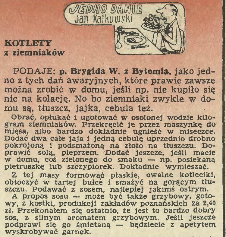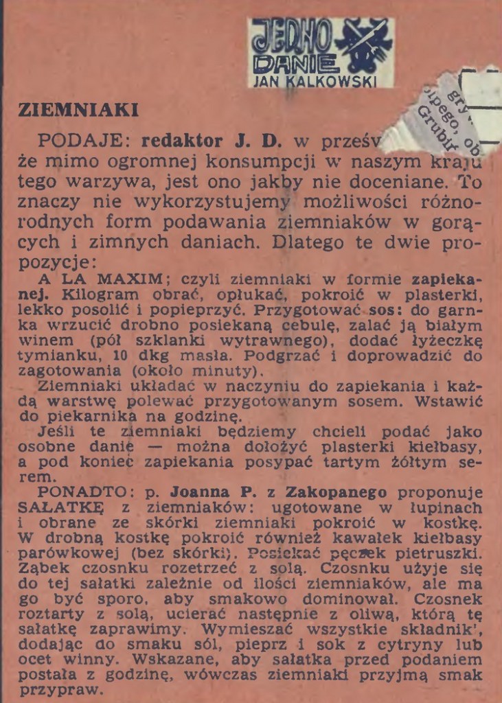 Teraz czas na przepisy ziemniaczane dawne, ale nie aż przedwojenne. Klasyka kulinarna z przekrojowej rubryki „Jedno danie” prowadzonej przez red. Kalkowskiego. Wszystkie pomysły zachowały aktualność! Choć mają zarazem i czar – jednak, choć z nutką ironii – PRL-u. Należą zarazem do kuchni polskiej, przechowywanej w rodzinach, nadsyłali je czytelnicy. Sałatka wśród nich też będzie.