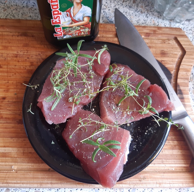 Co podamy na danie drugie? Może najprostsze steki z tuńczyka? Wiem, wiem, nie są tanie, ale te zrobione w domu będą kosztowały nie więcej niż tzw. smażona morska rybka nad Bałtykiem. Przyrządzimy je w kilka minut. Kto ma grilla na węgiel lub elektrycznego może je tam piec, ja wykorzystałam patelnię grillową, stawianą na kuchence.