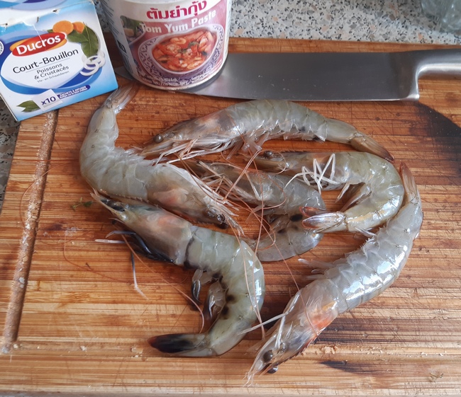W wodzie rozpuścić bulion i pastę tom yum (zacząć od jednej łyżeczki, dokładać, kosztując, do pożądanej ostrości). Krewetki obmyć, odłożyć. Łodygi selera lub/i pora przekroić na mniejsze kawałki. Marchew pokroić w plasterki, pieczarki obrać, obmyć, przekroić na pół lub w ćwiartki. Warzywa wrzucić do wywaru.