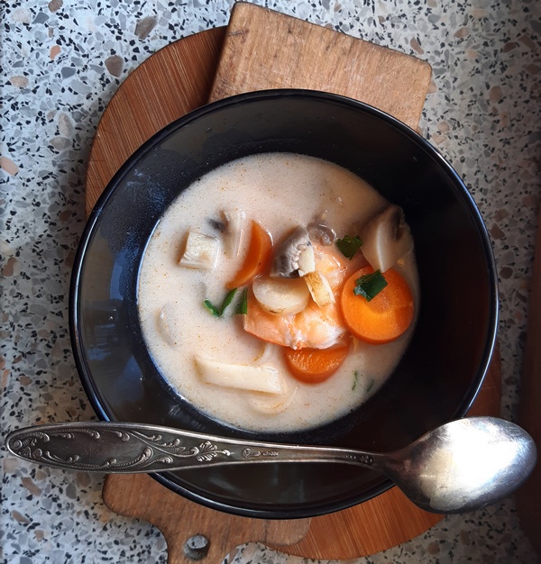 Zacznijmy od zupy. Kto lubi egzotyczne smaki, niech poszuka na półce z egzotycznymi smakami pasty do tajskiej zupy tom yum. Ostatnio wypatrzyłam ją w jednym z dyskontów. Trzeba ją ostrożnie dodawać, bo bywa bardzo ostra. Przynajmniej ta moja, z dawnych zapasów, taka jest. Przydaje zupy szczególnie pysznego smaku, lecz i ostrości wyrazistej, choć takiej, z jaką sobie radzą nawet podniebienia, które na co dzień jej nie znoszą (wypróbowane!). Tę zupę gotuję na bulionie z kostki. Nie wiem czemu, ale u nas nie sprzedaje się bulionu rybnego w żadnej postaci (kostki, pasta, saszetki). Warto przywieźć zapas z podróży lub poprosić kogoś wyjeżdżającego o taki prezent.
