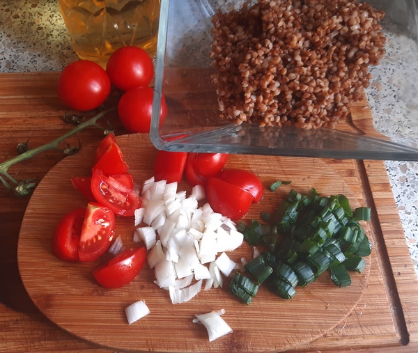 Kaszę ugotować zgodnie z przepisem na opakowaniu, wyjąć, włożyć do salaterki. W czasie, gdy kasza stygnie, pokroić w drobną kostkę pomidorki, cebulę i szczypior. Posiekać także natkę lub koperek. Wymieszać w salaterce z kaszą i olejem słonecznikowym. Doprawić do smaku solą i pieprzem. Sałatkę podawać letnią lub zimną.