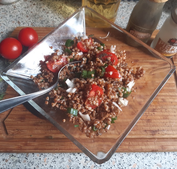 Do tak szybko usmażonej ryby podałam zieloną sałatę, ale i… sałatkę z kaszy gryczanej. Coś w rodzaju bliskowschodniej sałatki tabouleh, przyrządzanej z kuskusu lub burghulu. To sałatka swojska” z kaszy gryczanej. Kasz nigdy nie za dużo.