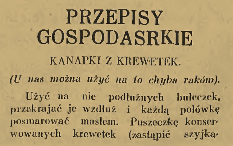 Uroczy obrazek, prawda? Dawnych przepisów na krewetki nie znajdziemy w polskiej literaturze kulinarnej dużo. Odnalazłam taki dopiero w nieocenionym „Bluszcz”, choć już z roku 1934. A i tak proponuje zastąpić je rakami. Urocza literówka w nagłówku.
